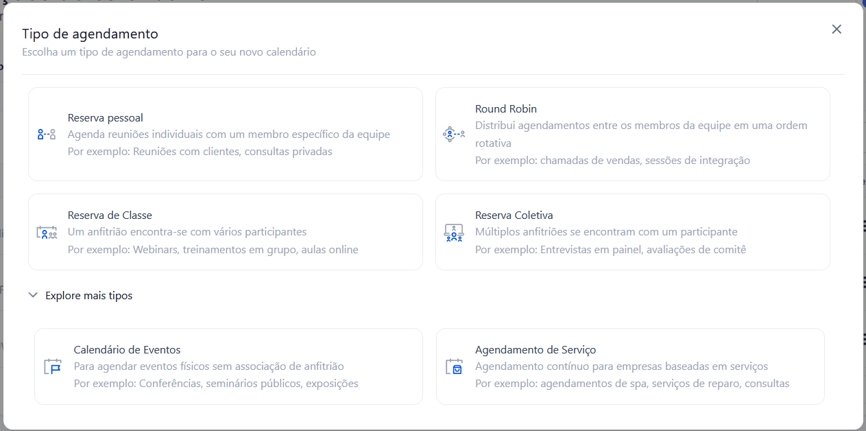 - Selecione um Tipo de Calendário Compatível: Opte por calendários como Reserva Pessoal, Agendamento de Serviço ou Calendário de Eventos, que são indicados para transações comerciais.