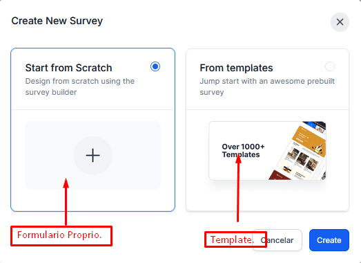 - Dentro do pop-up, você pode escolher entre duas formas principais de criar seus formulários:
